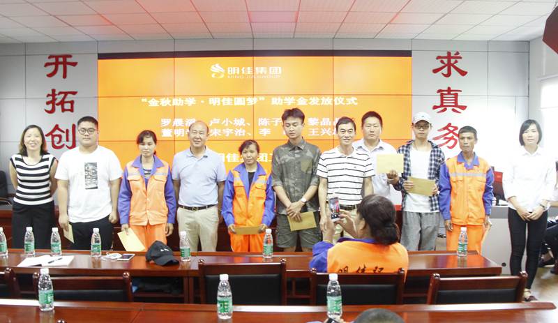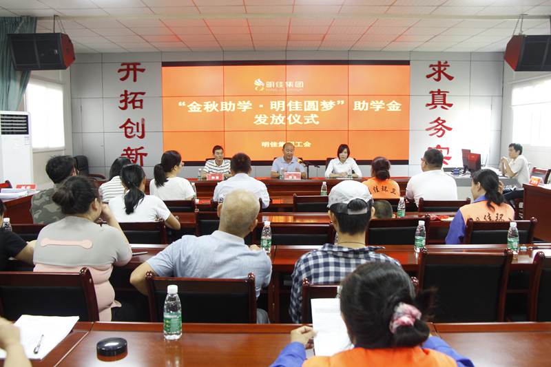 8月28日上午,明佳集團(tuán)工會“金秋助學(xué)·明佳圓夢”助學(xué)金發(fā)放儀式在集團(tuán)公司三樓會議室舉行,為8個考取大學(xué)的職工子女發(fā)放助學(xué)金共計9600元??偛藐愒啤⒏笨偨?jīng)理鐘寒參加發(fā)放儀式,儀式由工會主席高斐斐主持。