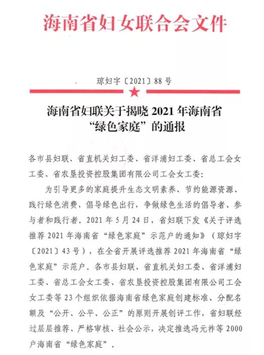 明佳集團(tuán)吉陽區(qū)域環(huán)衛(wèi)四隊隊長羅福英家庭于2021年10月22日被海南省婦聯(lián)推選為2021年海南省“綠色家庭”示范戶。