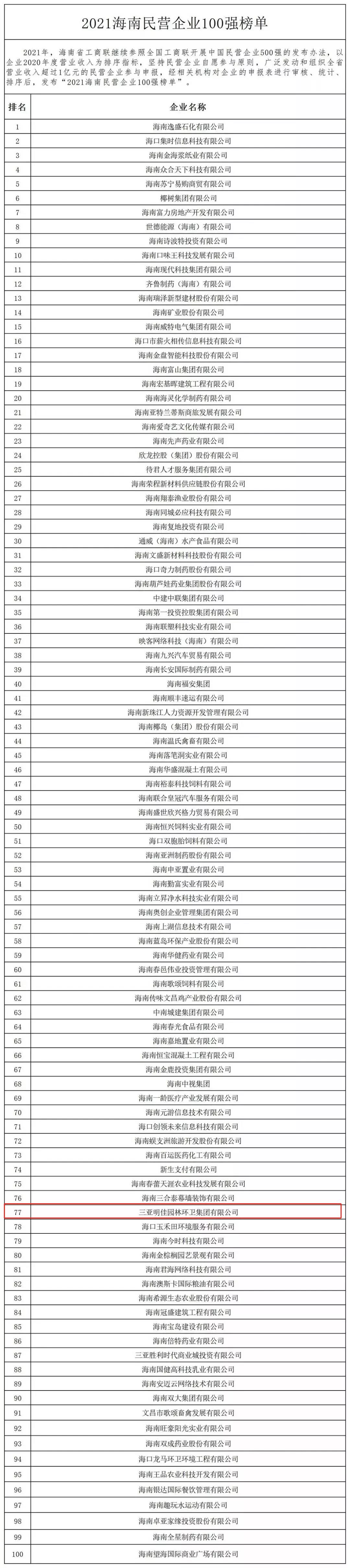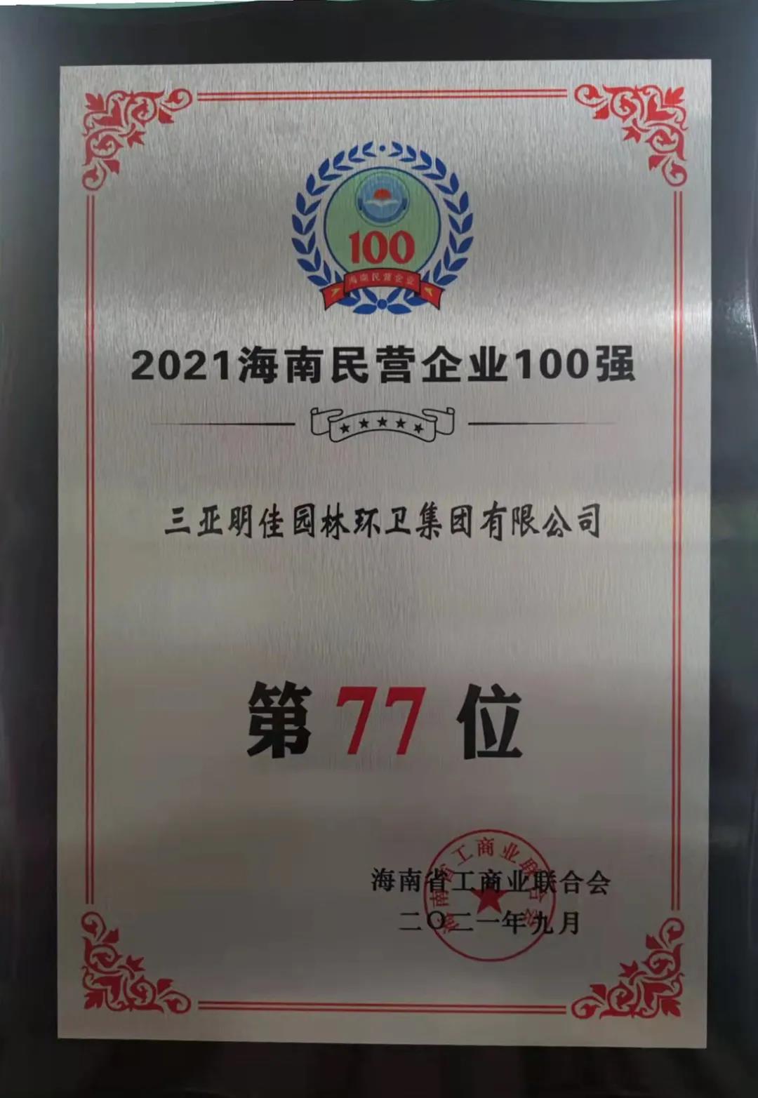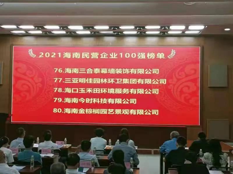 11月4日,海南省工商業(yè)聯(lián)合會(huì)在??诎l(fā)布“2021海南民營企業(yè)100強(qiáng)”榜單。三亞明佳園林環(huán)衛(wèi)集團(tuán)有限公司2019至2021年連續(xù)三年入選海南民營企業(yè)100強(qiáng)。
