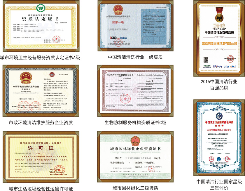 公司擁有建筑物外立面清潔養(yǎng)護施工甲級資質(zhì)、建筑物有害生物防治施工甲級資質(zhì)、建筑物日常清潔養(yǎng)護施工甲級資質(zhì)、中國清潔行業(yè)企業(yè)等級一級資質(zhì)證書、城市園林綠化企業(yè)資質(zhì)證書、有害生物防制服務機構(gòu)資質(zhì)證書C級、有害生物防制服務機構(gòu)C級資質(zhì)證書、中國清潔清洗行業(yè)國家一級等級資質(zhì)、城市生活垃圾經(jīng)營性清掃、收集、運營許可證;城市生活垃圾經(jīng)營性運輸、處置工作許可證、環(huán)境管理體系認證證書、城市環(huán)境衛(wèi)生經(jīng)營服務資質(zhì)認定證書(GB/T240012004/IOS14001:2004標準)、職業(yè)健康安全管理體系認證證書(GB/T28001—2011/OHSAS18001:2007標準)、質(zhì)量管理體系認證證書(GB/T19001—2008/iOS9001:2007標準)、市政環(huán)境清潔維護服務企業(yè)資質(zhì)證書